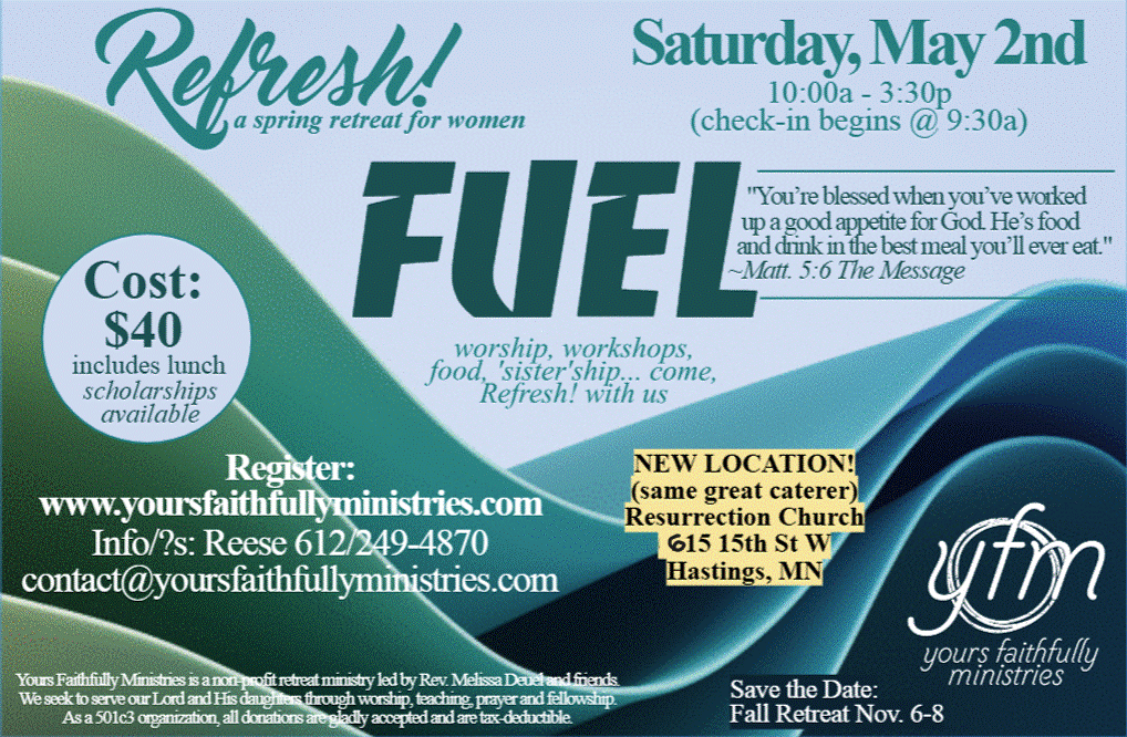 Our Spring Refresh! Retreat will be held Saturday, May 2nd at Resurrection Church in Hastings, Minnesota (details below). The theme will be "Fuel" and the theme verse is from Matthew 5:6. Invite some friends and register soon!